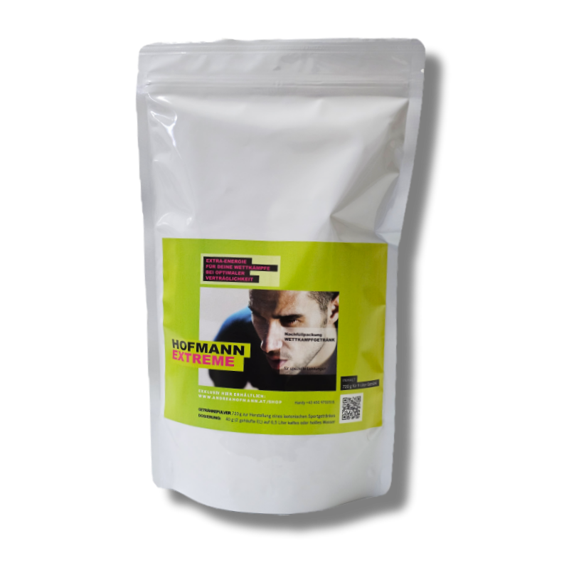 HOFMANN extreme liefert dem Körper die Extra-Energie für Wettkämpfe und spezielle Anlässe (exteme Berg- Kletter- oder Skitouren). Es  ist überaus verträglich, da die Inhaltsstoffe natürlich sind und die Bestandteile konsequent auf jene reduziert wurden, die nach wissenschaftlichen Erkenntnissen die Leistung während der Belastung fördern. Verzweigtkettige Aminosäuren (BCAAs) und Coffein erhöhen zusätzlich die körperliche Leistungsfähigkeit, mentale Bereitschaft und verzögern die Ermüdung. Auf einen Zusatz von Vitaminen, Mineralstoffen und  Spurenelemente wurde bewusst verzichtet, da diese die Aufnahme und Verträglichkeit während des Sportes reduzieren. Der Körper erhält mit HOFMANN extreme genau das, was er tatsächlich benötigt, was ihn stärker und leistungsfähiger macht.