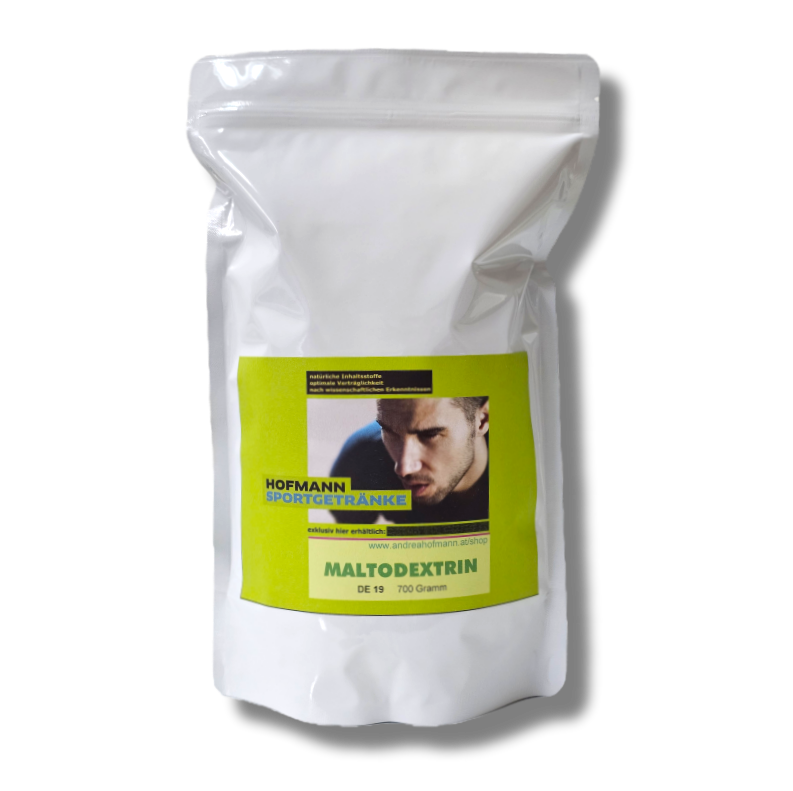 Der Name “Maltodextrin” bezieht sich auf verschieden lange Dextrosepolymere, das sind Ketten von Zuckermolekülen verschiedener Längen (DE19 ist ein mittellanges Polymer). Im Gegensatz zu Dextrose schmeckt es jedoch kaum süß und ist Hauptbestandteil vieler Sportgetränke. Es ist ein erstklassiger und günstiger Energielieferant und besteht aus praktisch 100 Prozent Kohlenhydraten.