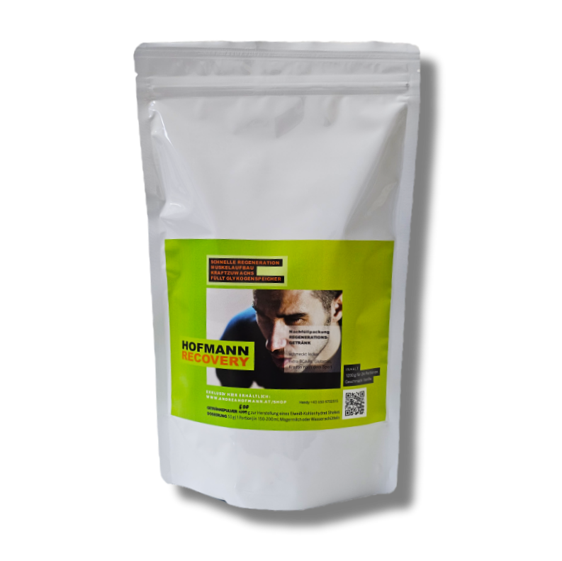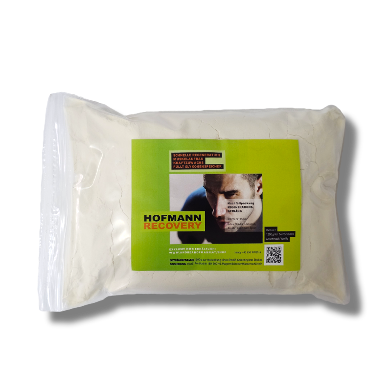 HOFMANN recovery liefert dem Körper Eiweiß und Kohlenhydrate für eine besonders rasche Regeneration und messbare Leistungssteigerung. Für intensive Trainingsphasen, Trainingslager, Trekkingtouren, Bergexpeditionen und Wettkämpfe die sich über mehrere Tage erstrecken. Wissenschaftliche Untersuchungen haben gezeigt, dass die Zufuhr von Eiweiß und Kohlenhydrat im optimalen Mengenverhältnis innerhalb der ersten halben Stunde nach Belastungsende die Erholungszeit mess- und spürbar beschleunigen und damit eine Leistungssteigerung mit legalen Mitteln gewährleisten kann. Das Produkt ist eine Mischung aus 60 Prozent rasch verfügbarer Kohlenhydrate für das Auffüllen der Glykogenspeicher und 30 Prozent Molkenproteinkonzentrat angereichert mit extra BCAAS und Kreatin für den Muskelaufbau und Kraftzuwachs. Ein hoher Anteil an L-Glutamin stärkt das Immunsystem und reduziert die Anfälligkeit gegenüber Erkrankungen.